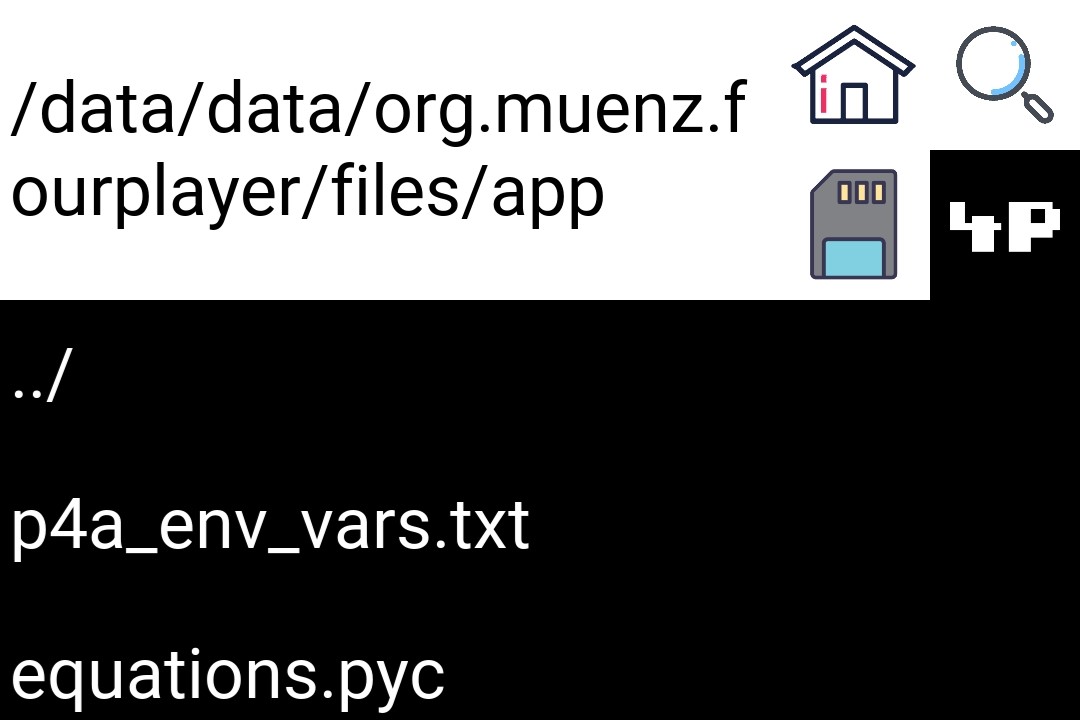 /data/data/org.muenz.fourplayer/files/appThis is the path where all the files are stored on your android phone. Your current path is always displayed on the top next to the for symbols as can be seen in the picture above. The functionalities of the symbols are