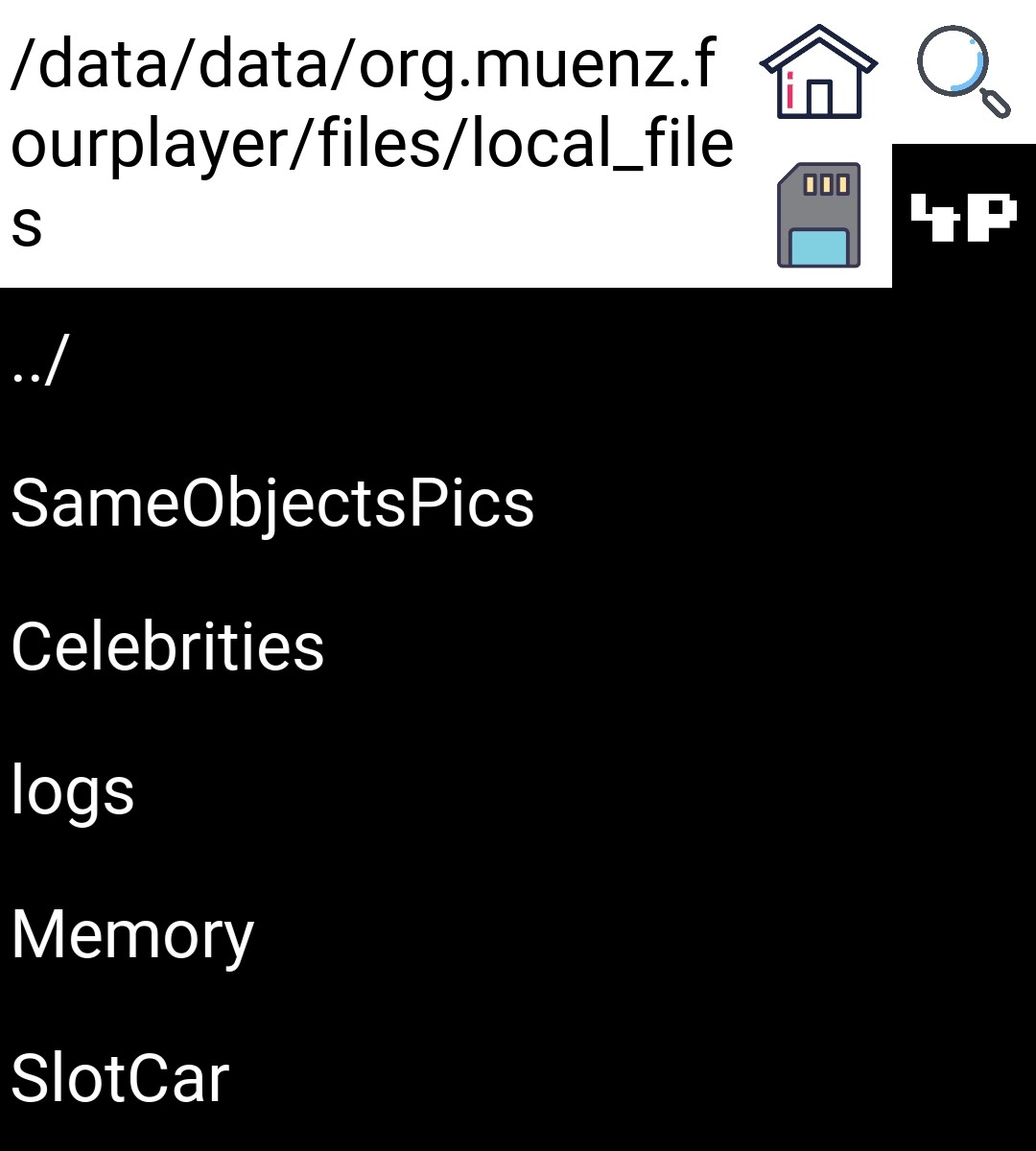 /data/data/org.muenz.fourplayer/files/local_filesYou can either navigate to this directory or type it via the search button (see basic navigation for more details). Here you can further customise your games.