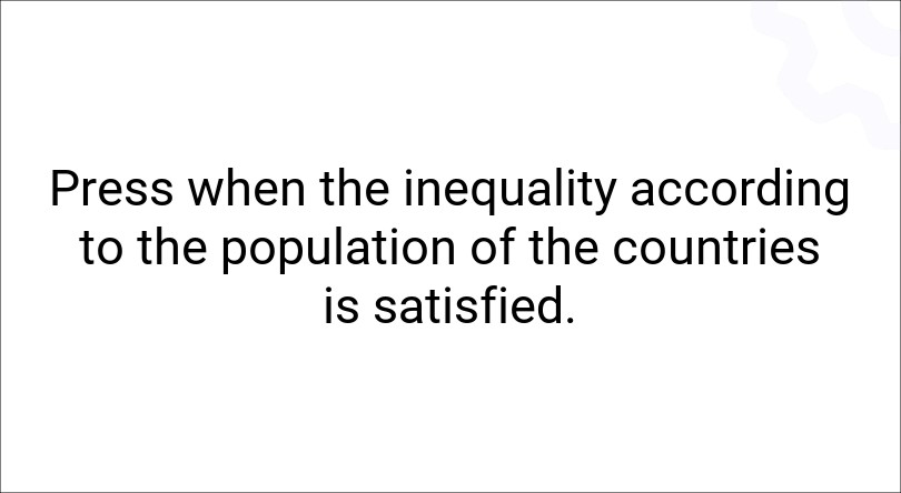 In the example above the task was to press the button when the inequality holds true for the population of the two countries. When a button is pressed the result will be revealed, meaning that the name of the country will be replaced by number of either its population or its area depending on what was sepcified prior to the game.