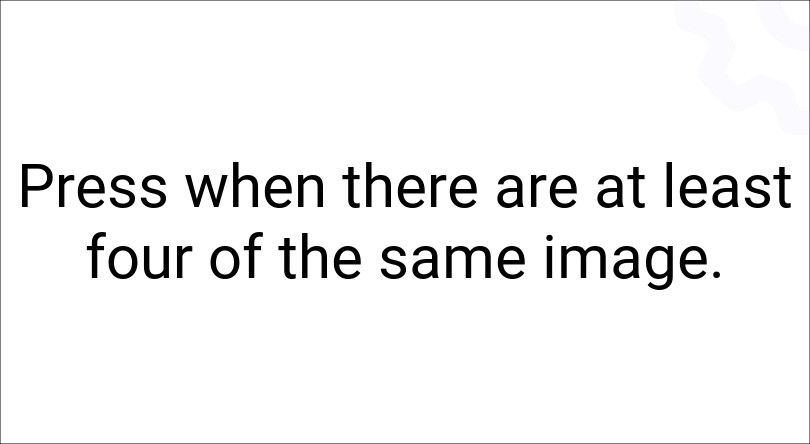 The goal of this game is to press the button whenever at least four of the same image are visible on the screen. The fastest one to do so will be awarded a point and your button will be highlighted in green (as can be seen in the picture above). In case of this event the other images will be darkened. In case a button is pressed and this requirement is not met you will lose a point, your button will be highlighted in red, and the game continues.